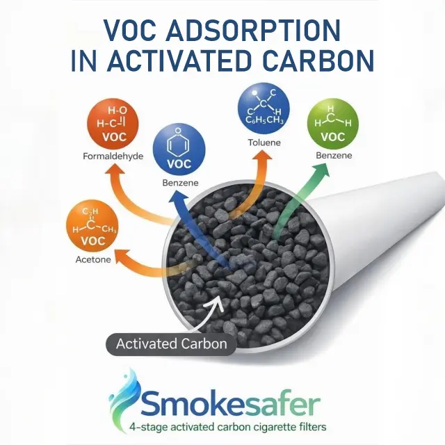 Standard cigarette filters only trap tar. They do not stop invisible Volatile Organic Compounds (VOCs) and Carbonyls that enter your bloodstream instantly.